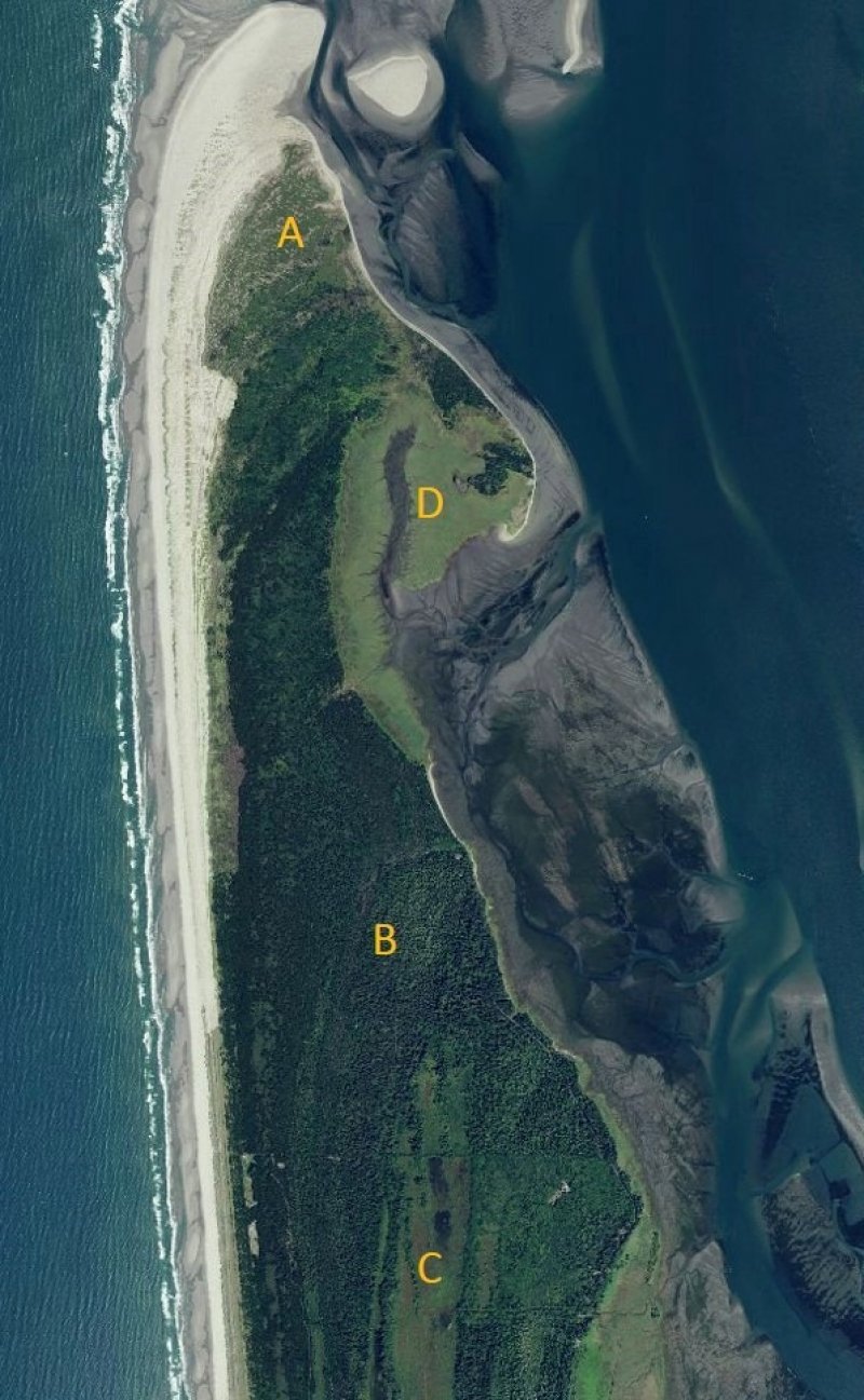 Figure 1. The area designated as “A” is the Foredune Scrub and Grassland site, “B” is the Dune Forest site, “C” is the Aquic Interdune site, and “D” is the Tidal Marsh and Estuary site.