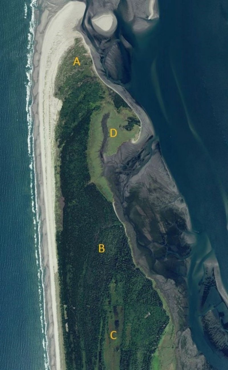 Figure 1. Ecological sites of the coastal/beach zone in LRU B of MLRA 4A. The area designated as “A” is the Foredune Scrub and Grassland site, “B” is the Dune Forest site, “C” is the Aquic Interdune site, and “D” is the Tidal Marsh and Estuary site.