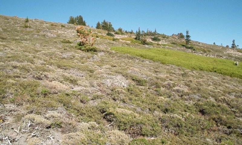 Vegetation: Mixed shrubs such as rubber rabbit brush (Ericameria nauseosa ssp. nauseosa var. speciosa), antelope bitterbrush (Purshia tridentata), greenleaf manzanita (Arctostaphylos patula), oceanspray (Holodiscus discolor), with scattered and windblown whitebark pine (Pinus albicaulis), Jeffrey pine (Pinus jeffreyi), and mountain hemlock (Tsuga mertensiana).