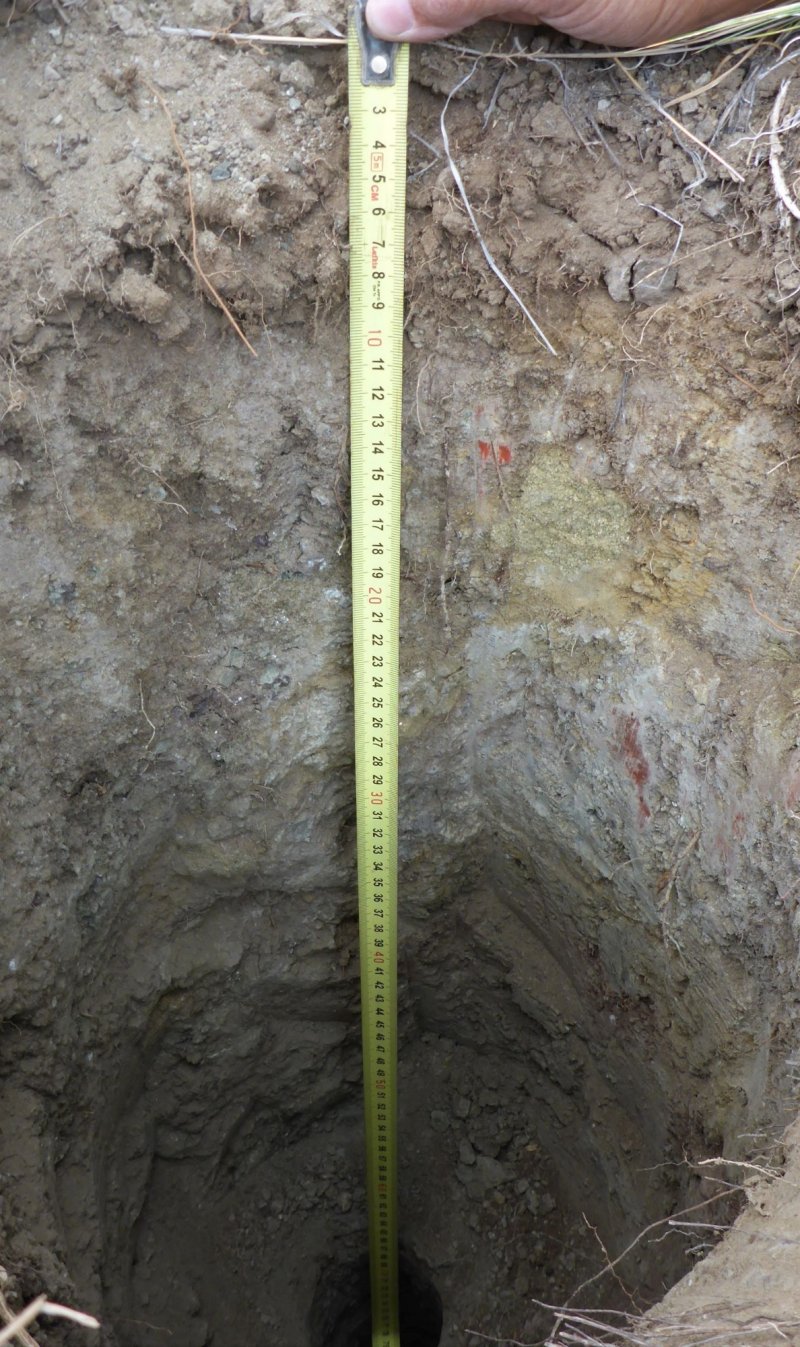 No compaction layer or soil surface crusting should be present. A dry subsurface will often refuse a probe, causing misidentification of a compaction layer. Soil profiles must be described by hand dug holes. -