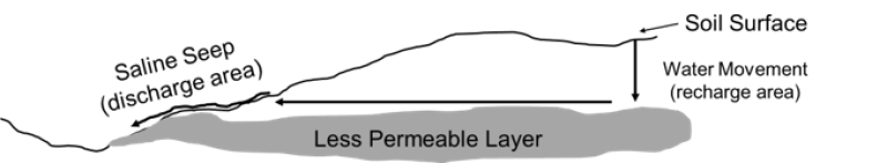 Salinization Risk – Removal of perennial vegetation (e.g., annual cropping), above this ecological site (recharge area), may result in increased water moving down through the soil profile. The potential salinization of the site can occur in any of the vegetative states; however, it is most prevalent in the State 4.0 Go-Back. This downward water movement leaches salts over time creating shallow saline groundwater immediately above a less permeable layer. Due to gravity, water moves downward through the soil profile then laterally through a porous layer, such as a coal or sand/gravel seam transporting salts to the discharge area. Below the porous layer, is a less permeable layer such as soft sedimentary bedrock. Where shallow saline groundwater occurs, salts often concentrate at or near the soil surface through capillary rise (discharge area). In capillary rise, water moves from where the soil is saturated, or nearly so, to drier soil against the force of gravity. Evaporation at the soil surface dries the soil and “pulls” water by capillary flow from the wet soil zone. Because only pure water evaporates, salts are left behind.