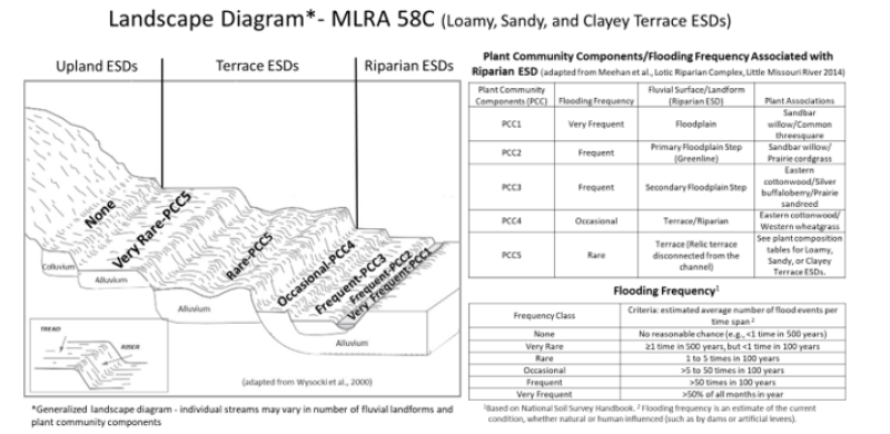 Riparian ESDs and their related plant associations are currently influenced by hydrology (flooding, groundwater, etc.) from the adjacent channel; whereas terrace ESDs are no longer flooded at a frequency or duration that affects plant associations. Remnant riparian vegetation (e.g., Plains cottonwood) may remain on terrace sites but become decadent or relict with no active recruitment. On rare occasions (extreme flooding), recruitment may occur; however, lack of soil moisture/water table may not allow successful seedling recruitment and long-term survival. These terraces and upland ESD sites are placed in ESDs according to soil classifications not by stream morphology (hydrology, type, classification, etc.). Upland ESDs formed in parent materials that were deposited by processes other than stream flooding (e.g., colluvium from steep areas of sedimentary plains).