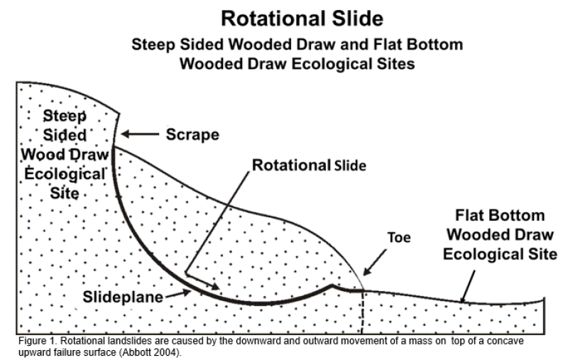 Figure 1. Rotational landslides are caused by the downward and outward movement of a mass on top of a concave upward failure surface (Abbott 2004).