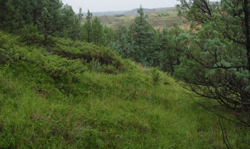 The Steep-Sided Wooded Draw ecological site occurs on moderately steep to very steep sideslopes of ridges (draws), as well as on slumps (rotational slides) and hillslopes in badlands and associated sedimentary uplands. The site typically has north or east aspect. Soils data suggests this site shifted temporally and spatially (via fire and drought) between sparsely wooded with herbaceous understory to closed canopy deciduous forest. Deciduous trees and shrubs are established in these areas; however, periods of herbaceous plants increased on the site following fire. Soils on this site are well drained and deep or very deep. Typically, a thin O horizon (<3 inches thick) overlays the mineral soil. The A horizon has a loam, silt loam, or clay loam texture. Immediately below the A horizon is a non-calcareous subsoil layer (Bw or Bt horizon); this horizon forms a ribbon 1 to 2 inches long. A layer of carbonate accumulation (Bk or Btk horizon) is commonly within a depth of 24 inches. On the landscape, the Steep-Sided Wooded Draw site is below the Badland, Shallow Loamy, and Very Shallow ecological sites. Limy Residual and Loamy sites are on similar or lower landscape positions. Claypan, Loamy Overflow, and Flat Bottom Wooded Draw sites are below the Steep-Sided Wooded Draw sites. Slopes range from 9 to 70 percent.