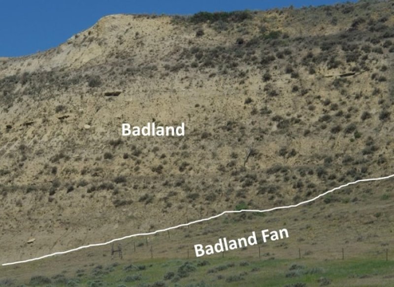 Badland ecological sites consist of bare, eroding exposures of soft siltstone and shale bedrock on steep-sided buttes, escarpments, knobs, ridges, and in deeply entrenched, steep-sided- drainageways. The exposed bedrock makes up about 80 percent of any given area and supports little or no vegetation. Associated ecological sites include Badland Fan, Limy Residual, Very Shallow, and Shallow Loamy.