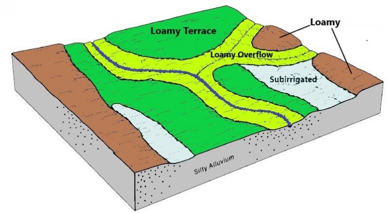 The soil series associated with the Loamy Terrace ecological site are very deep, moderately well to well drained, moderately permeable soils formed in alluvium. These valley and low terrace soils have slopes typically ranging from 0 to 2 percent.