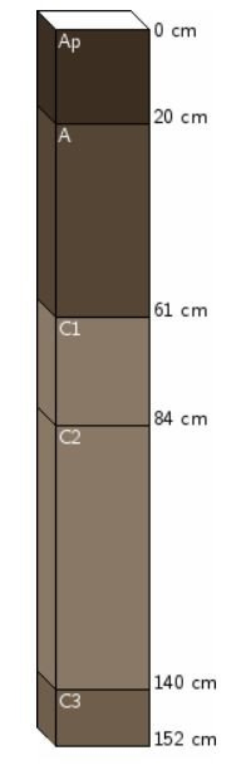 The A-horizon should be 7 to 24 inches (18-60 cm) thick (Bigbend is 3 inches). Soil is very dark gray, dark grayish brown, or gray (values of 4 to 5) when dry and dark brown, very dark grayish brown, or very dark brown (values of 2 or 3) when moist; Bigbend, Nimbro, and Haynie may be dark grayish brown or grayish brown (value of 5),. Structure is variable with soil series and ranges from granular to subangular blocky to platy.