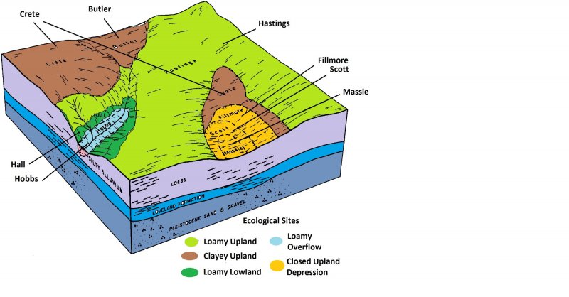 Loess overlays the surface of almost all of the uplands in this MLRA. Alluvial clay, silt, sand, and gravel are deposited in the stream and river valleys and can be extensive in the major drainages. Terraces are common in the valleys along the river systems. The predominate soil orders are mesic, udic Mollisols and Entisols, commonly represented by the Coly, Uly, Cozad, Hord, Hall, and Holdrege soil series.