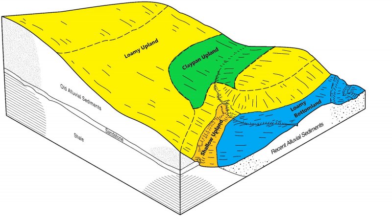 Claypan Upland (North) Similar landscapes. Restrictive subsurface claypan. Lower production. |
