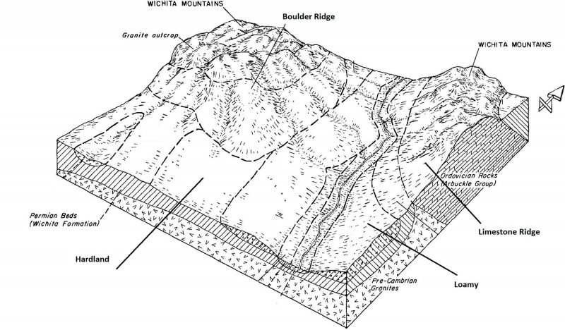 Buck, Paul. 1964. Relationships of the woody vegetation of the Wichita Mountains Wildlife Refuge to geological formations and soil types. Ecology 45: 336-344.