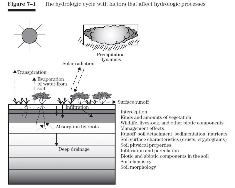 Infiltration and runoff are affected more by the slope and the amount of rocks on the surface (15-40%) than any changes in plant community composition and distribution. (Tallgrass/Midgrass dominated). Any changes in infiltration and runoff can be attributed to other factors (e.g. compaction). -