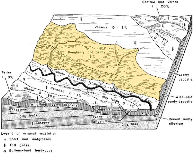 MLRA 84A “North Cross Timbers” is characterized by rolling to hilly uplands with oak trees, bedrock outcrops, and narrow stream valleys. It is believed that the Cross Timbers ecosystem is one the least disturbed forest types remaining in the Eastern US. Major rivers in this MLRA include the Verdigris River in Kansas and the Arkansas, Cimarron, and South Canadian Rivers in Oklahoma. The western parts of this MLRA are underlain by sandstone and shale of Permian age, while the eastern parts are underlain by sandstone and shale of Pennsylvanian age. There are also occurrences of Pleistocene age stream terraces along the rivers.