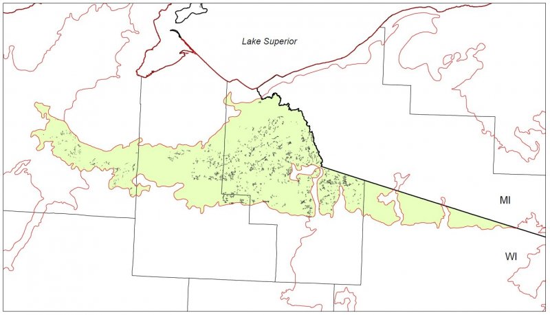 The climate is influenced by Lake Superior in areas near the lake, resulting in cooler summers, warmer winters, and greater precipitation – especially snowfall – compared to more inland locations. Historically, mixtures of eastern hemlock (Tsuga canadensis), sugar maple (Acer saccharum), yellow birch (Betula alleghaniensis), eastern white pine (Pinus strobus), and red pine (Pinus resinosa) covered the area. In wetter pockets (such as the swamps that dot the moraines to the south) white cedar (Thuja occidentalis), black spruce (Picea mariana), and tamarack (Larix laricina) were common (Finley, R., 1976).