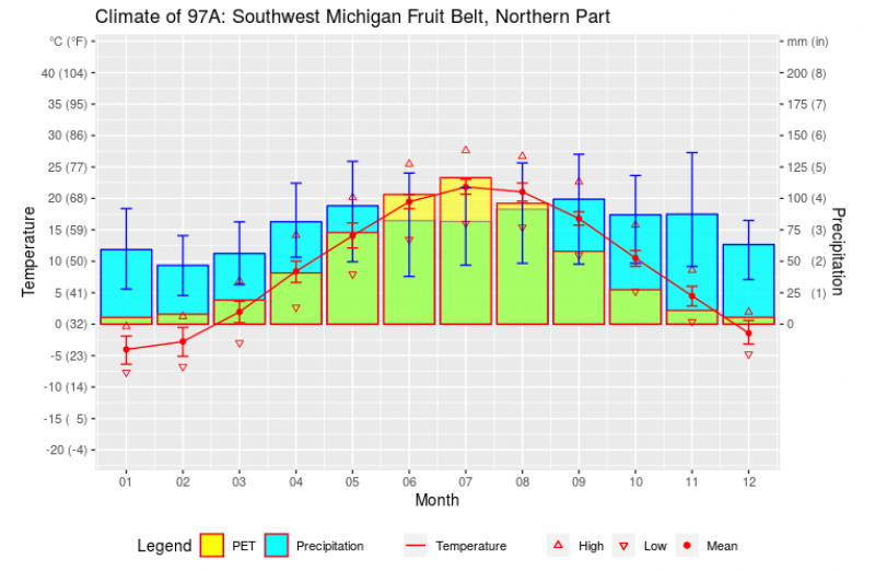 The area falls within USDA Hardiness zones 6a and 6b and has delayed spring warm up until after the last killing frosts, allowing for a wide range of fruit crops to be grown.