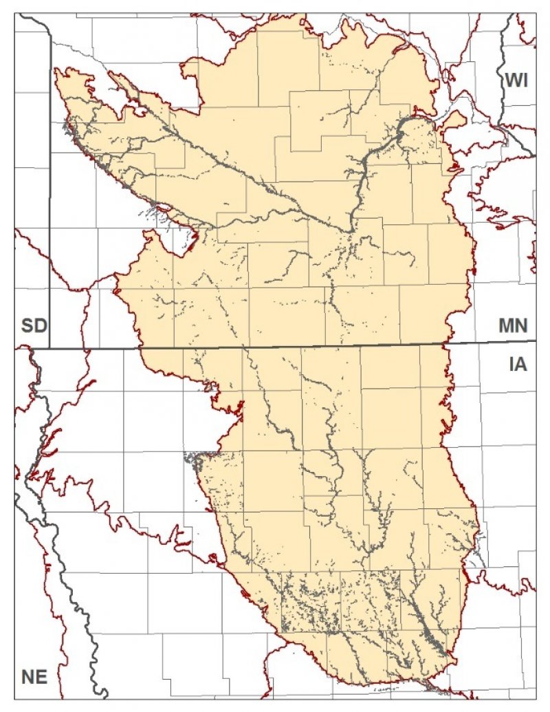 MLRA 103 is in Minnesota (56 percent) and Iowa (44 percent) and consists of approximately 18 million acres. It is in the Western Lake Section of the Central Lowland Province of the Interior Plains in an area known as the "Des Moines Lobe" of the Wisconsin-age ice sheet. The MLRA is mostly on a young, nearly level to gently rolling, glaciated till plain that has moraines and glacial lake plains in some areas. The plain is covered with glacial till, outwash, and glacial lake deposits. Recent alluvium consisting of clay, silt, sand, and gravel fill the bottoms of most of the major river valleys. Paleozoic bedrock sediments, primarily shale and limestone, underlie the glacial deposits in most of the area. The annual precipitation increases from northwest to southeast. Most of the rainfall occurs as high-intensity, convective thunderstorms during the summer. Two-thirds or more of the precipitation falls during the freeze-free period. Snowfall is common in winter. Ground water supplies are adequate for the domestic, livestock, municipal, and industrial needs. Nearly all of this area is farmland, and about four-fifths is cropland.