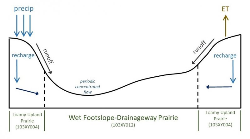 Wet Footslope/Drainageway Prairies The Footslope/Drainageway Prairies ecological site are located on mainly on footslopes, toeslopes, and upland drainageways. The site concept incurs frequent to occasional extremely brief and very brief flooding. Soils drainage class is poorly drained. Reference vegetation is a wet prairie. |