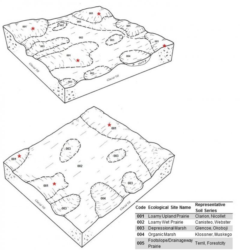 The Loamy Upland Prairies ecological site is located on loamy, upland soils formed in glacial till and lacustrine materials. Soils were formed under native prairie and have a dark surface layer (mollic epipedon). Characteristic vegetation includes leadplant, big bluestem, and a diversity of native forbs. This site does not flood or pond.