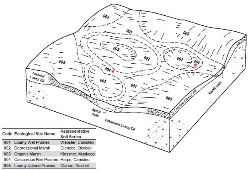 The Calcareous Rim Prairie ecological site is characterized by three states: the Reference State, the Tillage State, and the Woodland State. The Reference State includes two communities. The High Diversity Prairie, is characterized by a fire return interval of 3 years or less and the Old Growth Prairie is characterized by a fire return interval of up to 5 years. Grazing can also be a trigger for change on this ecological site. The Tillage State includes the Row Crop Community and the Seeded Grassland Community. State 3 in this model describes a woodland on untilled soils dominated by boxelder, green ash, willow, and cottonwood.