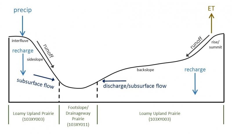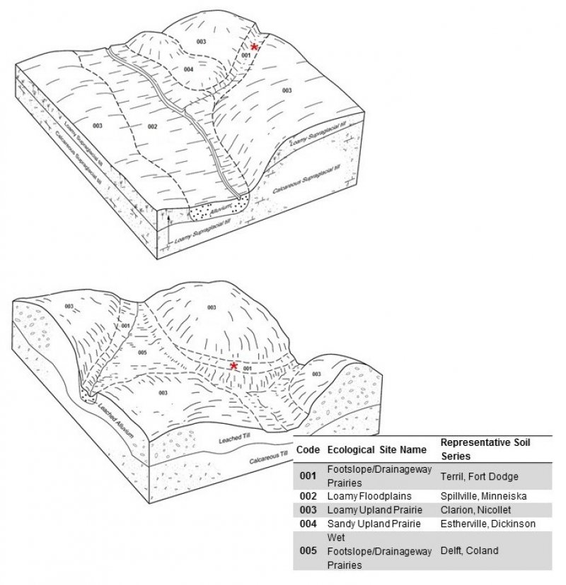 The Footslope/Drainageway Prairies ecological site is characterized by two states: the Reference State (native prairie) and the Tillage State. In this model, two plant communities exist in the Reference State and are characterized by different fire return intervals. The mechanism of change between communities is fire frequency and the resulting effects fire has on the plant community. Grazing and drought can also be a triggers for change on this ecological site. The Tillage State describes areas that have been tilled and may have modified hydrology (ditching, tiling). Two communities make up the Tillage State: the Row Crop Community and the Seeded Grassland Community. Some areas of this ecological site are wooded; however, the percentage of acreage in MLRA 103 is small, so this community is not described within the current state and transition model.