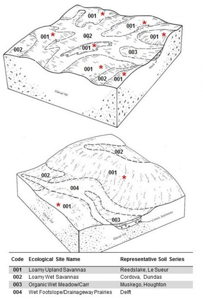 Loamy Wet Savannas The Loamy Wet Savannas ecological site is located on soils that are derived from fine loamy till. Soils are classified as poorly drained. This site occurs on morainal ridges or in slight concavities and linear segments with a slope of less than 2 percent. |