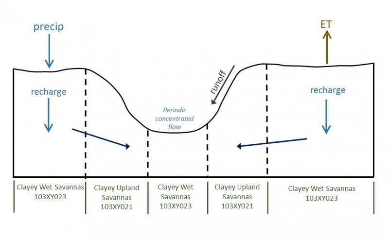 The Clayey Wet Savannas ecological site is characterized by poorly drained, fine-textured soils that developed under a mix of native wet tolerant grasses and scattered trees. No flooding or ponding occurs on this site, but the seasonal high depth to soil saturation is between 0-30 cm. Grazing, drought, and periodic fires are important disturbance triggers that influence plant community structure and composition.