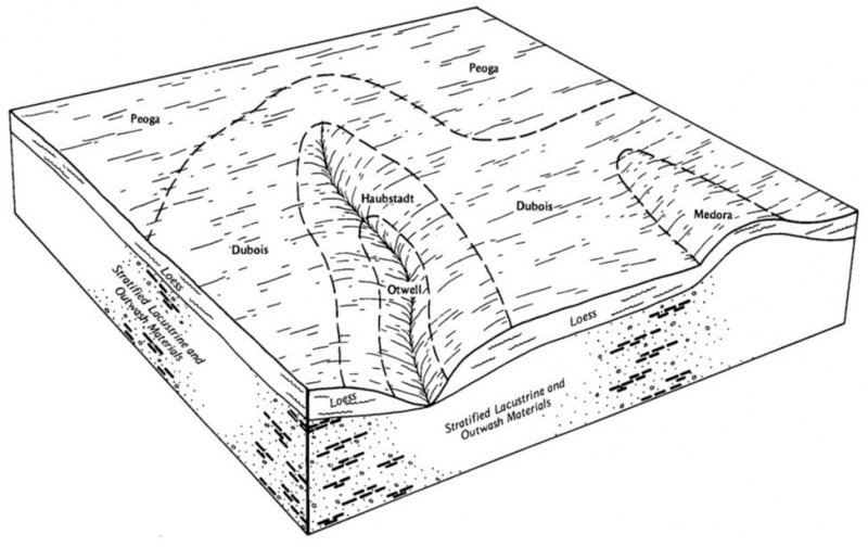 Both large and small tributaries of the Ohio River dissect the nearly level to very steep glaciated uplands in this area. The major streams and rivers have well defined valleys with broad flood plains and numerous stream terraces. The flood plains along the smaller streams are narrow. Broad summits are nearly level to gently sloping. Elevation ranges from 320 feet (100 meters) on the southernmost flood plain along the Ohio River to 1,250 feet (380 meters) on the highest ridges. Local relief is mainly 10 to 50 feet (3 to 15 meters), but it can be 50 to 100 feet (15 to 30 meters) along drainageways and streams. Also, the Ohio River bluffs are as much as 300 feet (90 meters) above the river valley floor.