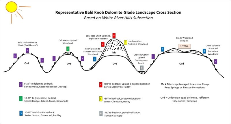 The schematic shows representative geologic landscape cross-section highlighting landscape relationships with associated ecological sites in the White River Hills subsection. Bald Knob Dolomite Glade sites can transition to a limestone substrate in locations that have a contact with Mississippian geology. The limestone component is typically narrow and quickly transitions from glades to woodland sites. Ordovician-aged Jefferson City-Cotter dolomite, a substrate which is abnormally resistant to weathering, underlies the bald knob glades, producing these distinctive glade communities. Included is a representative Bald Knob Dolomite Glade landscape cross-section in the White River Hills subsection