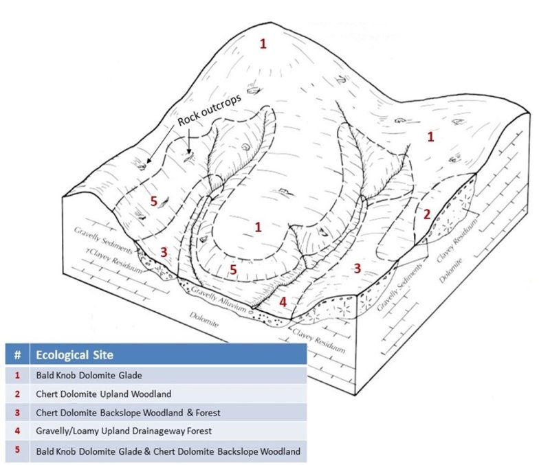 This site is on upland crests, shoulders and backslopes with slopes of 3 to 65 percent (Figures 2 and 3). The site generates runoff to adjacent, downslope ecological sites, and in places receives runoff from upslope summit and shoulder sites. This site does not flood. Figure 2 (adapted from Festervand and Preston, 2005) shows the typical landscape position of this ecological site, and landscape relationships with other ecological sites. It is the areas labeled 1 and 5 in the figure. The dashed lines within the area indicate separations or transitions among the various ecological sites. Bald Knob Dolomite Glade sites are typically associated with Chert Dolomite Woodland and Forest sites, labeled 2, 3, 5. Table 1 displays representative physiographic features based on NRCS pedon data from the National Soil Information System for Bald Knob Dolomite Glade ecological sites.