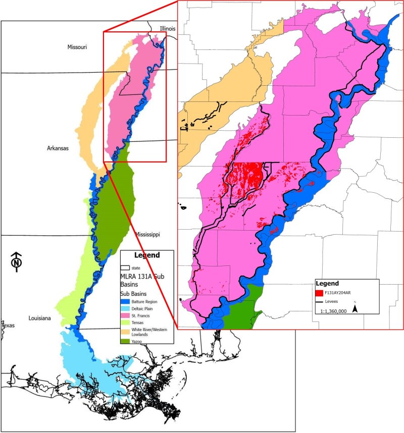 The St. Francis Basin is geographically positioned in northeastern Arkansas and southeastern Missouri where it, in addition to the Batture and Western Lowlands, form the northern terminus of MLRA 131A. For convenience and ease of administering the Ecological Site Inventory, small portions of the MLRA occurring east of the Mississippi River in extreme western Tennessee and Kentucky are collectively grouped with the basin’s extent in Arkansas and Missouri. The following characterization includes the combined area.