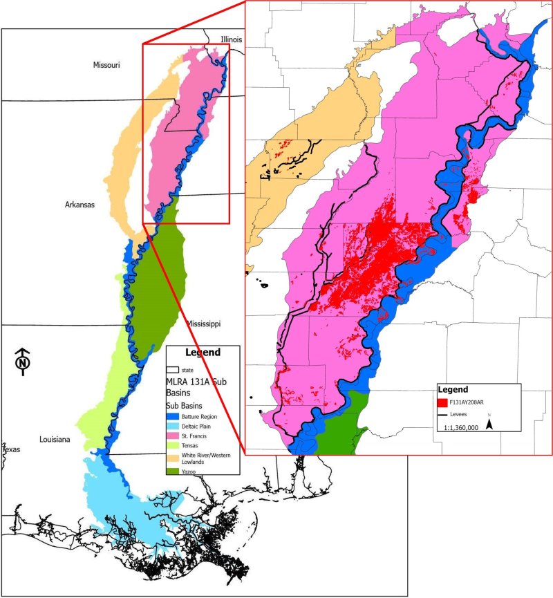 The St. Francis Basin is geographically positioned in northeastern Arkansas and southeastern Missouri where it, in addition to the Batture and Western Lowlands, form the northern terminus of MLRA 131A. For convenience and ease of administering the Ecological Site Inventory, small portions of the MLRA occurring east of the Mississippi River in extreme western Tennessee and Kentucky are collectively grouped with the basin’s extent in Arkansas and Missouri. The following characterization includes the combined area.
