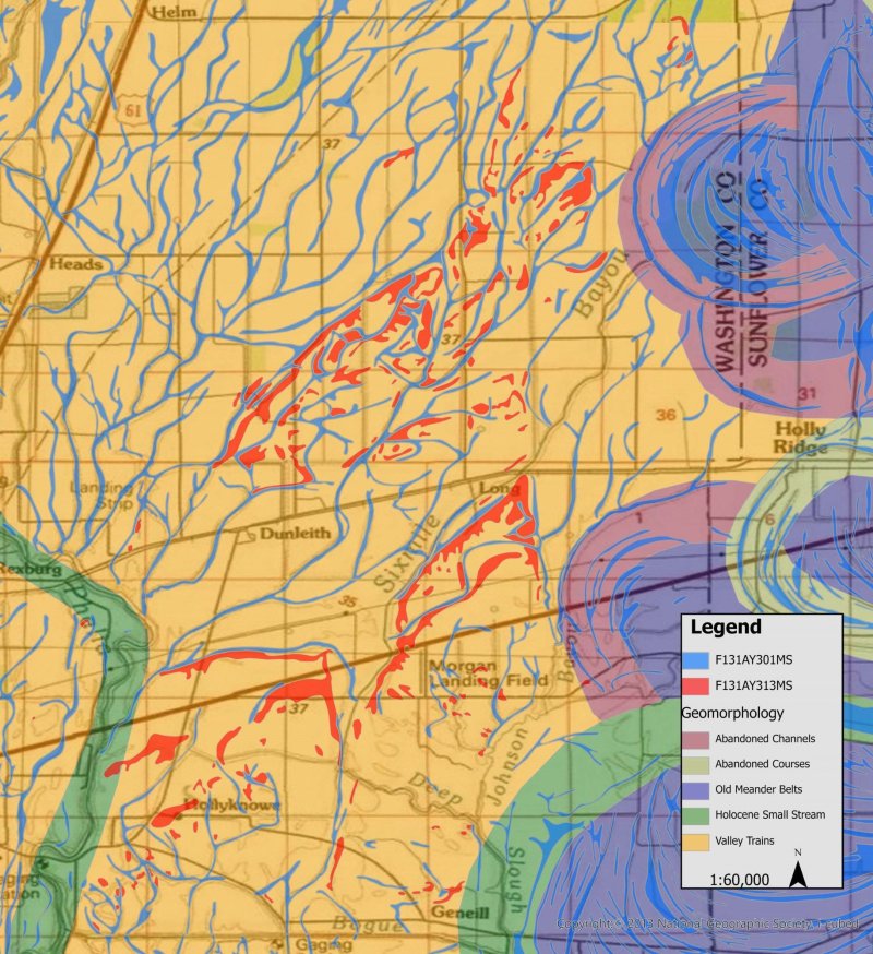 Yazoo - Frequently Flooded and Ponded Oxbow and Swale Forest This site occupies depressions within remnant glacial outwash channels on Pleistocene valley trains, which adjoins the relic braid bars of site F131AY313MS. |