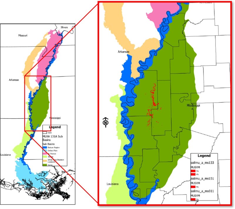 Due to its size and biophysical variability, the technical team advised subdividing the MLRA into six subregions: Western Lowlands, St. Francis Basin, Yazoo Basin, Tensas Basin, Delta Plain, and Batture.