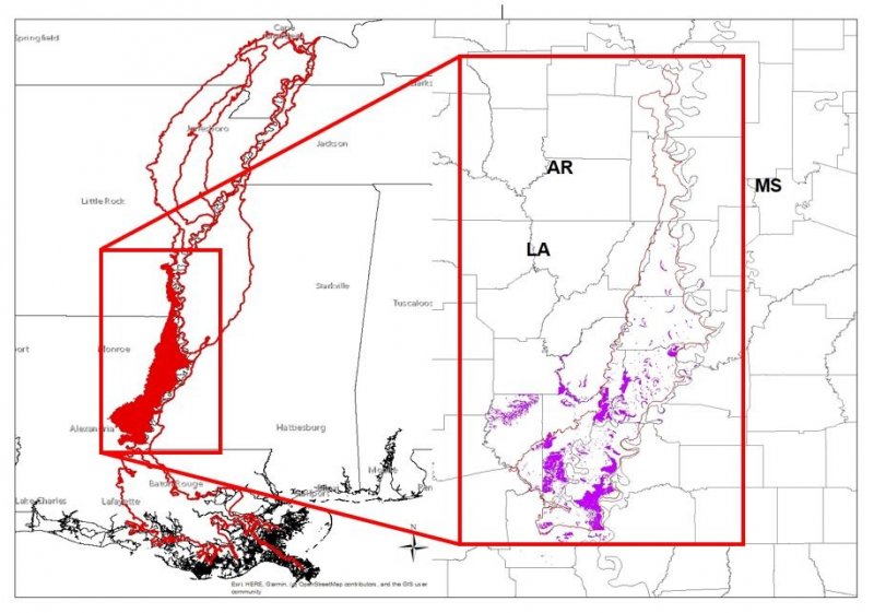 As mentioned previously, this subregion’s southern extent is found at the Red River where the Old River Control Structures regulate the flows of the Mississippi, Red, and Atchafalaya Rivers. Additional components include the river levee systems which further regulate the flows and flooding of these rivers and their tributaries. These man-made constraints to the system have substantially altered the hydrologic functions of the sites found within the whole of MLRA 131A. Areas within the confines of the levee systems, the unprotected areas, have increased frequency, duration, depth, and force of flooding. The areas outside of the levee systems, the protected areas, have reduced total flooding other than catastrophic events. These hydrologic alterations have changed ecological sites within the MLRA to where attempts at describing historic communities are at best scientific concepts, so most sites are described based on current regimes.