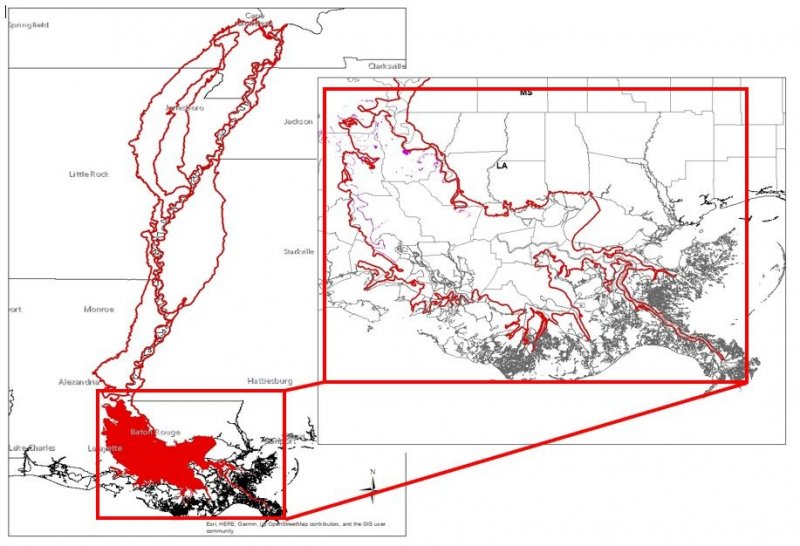 The Deltaic Plain of MLRA 131A is located in Louisiana, south of the Old River Control Structure on the Mississippi River. This portion of the MLRA is greatly affected by changes in hydrology over time, by both natural and anthropogenic forces. The landscape was built by the flooding of the Mississippi River with influences of the entire drainage basin.