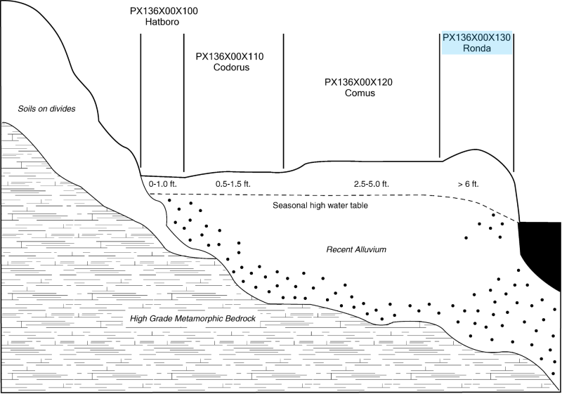 The landscape is generally rolling to hilly, with a well-defined drainage pattern. Streams have dissected the original Piedmont plateau, forming narrow ridgetops, somewhat broad interfluves, and short, steep side slopes adjacent to the streams and drainageways. With some exceptions, the valley floors are generally narrow and make up about 10 percent or less of the land area. The associated stream terraces are generally small and of minor extent.