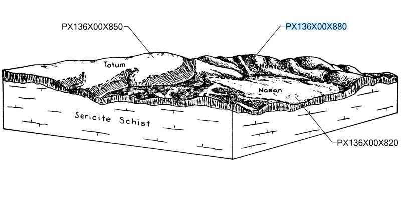 Precambrian and Paleozoic metamorphic and igneous rocks underlie almost all of this MLRA. The dominant metamorphic rock types include gneiss, schist, slate, argillite, and phyllite, among others. Dominant igneous rock types include granite and other related felsic crystalline rocks. Mafic intrusive rocks, including gabbro, diabase, amphibolite, and other dark colored rocks, underlie a minority of the upland landscape. These mafic intrusions crop out in the form of dikes and sills, and often weather to produce soils high in base cations.