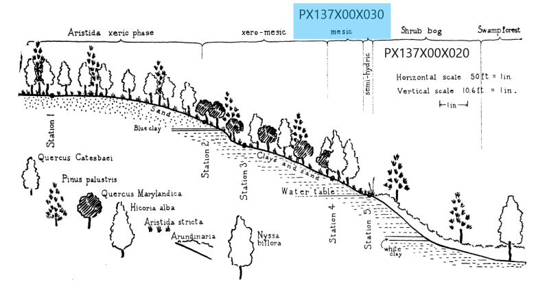 Subcanopy layer: Quercus incana, Quercus marilandica, Quercus margaretta, Diospyros virginiana, Sassafras albidum, Nyssa sylvatica, Cornus florida, Prunus serotina, Oxydendrum arboreum, Carya tomentosa, Carya pallida, Quercus stellata, Quercus falcata, Quercus nigra, Quercus hemisphaerica