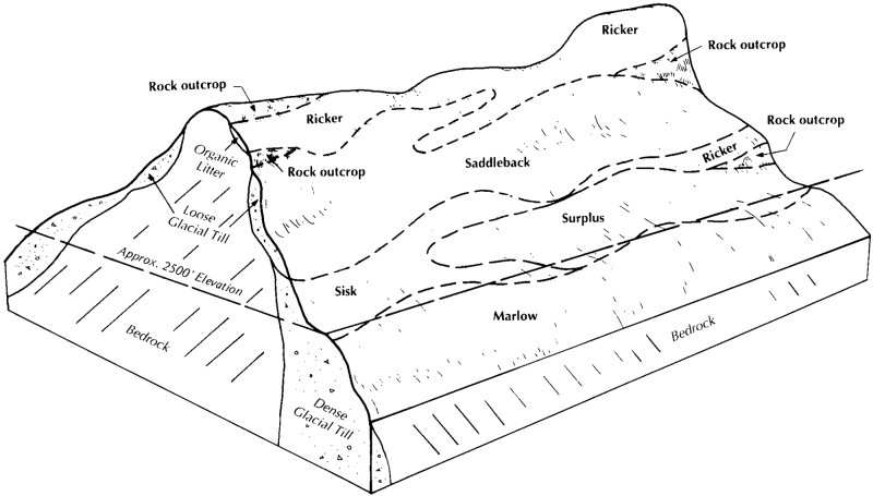 The characteristic landforms and soils of northern New England were derived from the massive continental ice sheet that engulfed the region during North America’s most recent glaciation. Mighty glaciers, embedded with sediment and rock fragments, scoured bedrock and compacted mineral beds in a steady march south and east toward the Atlantic Ocean. The softer sedimentary rocks were pulverized into fine silts and clays under the immense weight of ice a mile thick, while the more resistant igneous and metamorphic rocks were sculpted into steep mountains and hills or plucked and dragged along the base of the glacier. With a warming climate, the ice retreated northward, depositing a thin layer of unsorted glacial till sediment atop the newly-exposed bedrock and compacted mineral beds. Deeper mounds of unsorted till formed small hills, kames, moraines and drumlins. Enormous chunks of ice detached as the glacier retreated, melting slowly in place and forming many kettle lakes and basins where water and fine sediments collect. Raging torrents of glacial meltwater dissected much of the barren landscape, entraining coarse and fine sediments, carving river valleys, and leaving well-sorted deposits of mostly sand and gravel along the watercourse. By 10,000 years ago the ice sheet had fully receded from MLRA 143. Silty floodplains developed along perennial rivers, many of which occupy the same channels that once gushed with sediment-rich glacial meltwater. Over time, wet basins accumulated fine sediment, some dried out, and still others became acidified by organic matter inputs from colonizing vegetation.
