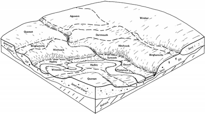 This area has been glaciated and consists almost entirely of till hills, drumlins, and bedrock-controlled uplands with a mantle of till. It is dissected by narrow glacio-fluvial valleys. The southernmost boundary of the area marks the farthest southward extent of Wisconsinian glaciation on the eastern seaboard. The river valleys and coastal plains are filled with glacial lake sediments, marine sediments, and glacial outwash. The bedrock in the eastern half of the area consists primarily of igneous and metamorphic rocks of early Paleozoic age. Granite is the most common igneous rock, and gneiss, schist, and slate are the most common metamorphic rocks. In the parts of the MLRA in eastern and southeastern New York, Devonian- to Pennsylvanian-age sandstone, shale, and limestone are dominant. Carbonate rocks, primarily dolomite and limestone, are the dominant kinds of bedrock in the part of this MLRA in northwestern Connecticut.