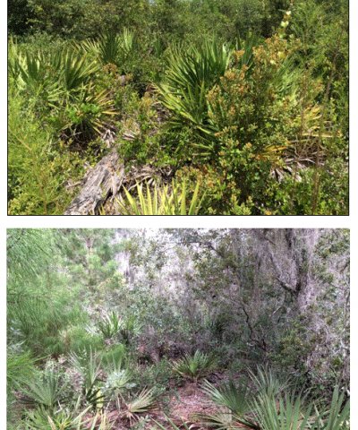 State 1 vegetation is scrub or xeric hammock. These natural communities are comprised of dense growths of scrub oaks (myrtle, Chapman’s and sand live oaks) and palmetto (saw and scrub palmetto). Phases within this State vary in their community structure and periodicity of fire (or other natural or anthropogenic disturbances).