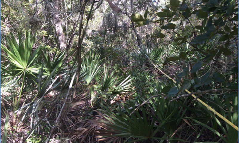 Phase 1.1 vegetation is predominantly dense growths of scrub oaks (myrtle, Chapman’s and sand live oaks) and palmetto (saw and scrub palmetto). Canopy is absent in this early successional phase, either because sand pine seed source is unavailable or has not yet colonized the stand following disturbance. The dense establishment of clonal oaks discourages colonization of other pine species (longleaf and slash pines), as these species require abundant light and bare ground for germination. Phase 1.1 scrub oaks reach heights of 3 to 5 feet (0.9 to 1.5 m).