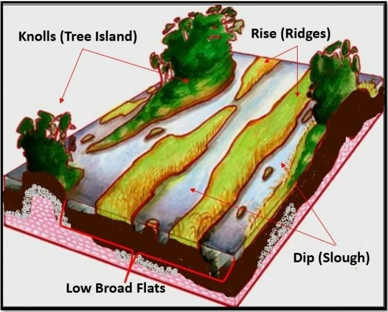 The water in these dips\sloughs is slow moving, and sloughs may dry completely during droughts. In South Florida, some of these areas have formed from the burning of underlying sapric organic soil materials layers in strand swamps and glades marsh during droughts. These sloughs\dips also known as depressions then fill with water when the site is once again flooded causing longer hydroperiods (6 to 11 months) allowing water emergent vegetation communities to be established. As such, these can be shifting communities, with old sloughs eventually filling in with peat while new ones are created by peat fires which cannot be mapped and are part of the system. Coastal plain willow is a common colonizer when fires have consumed soils in the Everglades Ecoregion. Alligators further create heterogeneity in sloughs by wallowing and digging in the peat substrate, excavating “gator holes” which will elongate the hydroperiods (6 to 11 months) and resulting in the creation of refuge for wildlife during droughts. Under drought conditions, wildfires may burn down the peat layer, destroying sawgrass roots and converting these areas to lower elevation creating longer hydroperiods (6 to 11 months) allowing emergent communities or to deeper water (sloughs\dips). Topographic variation may result not only from severe fires, but also from highs and lows in the underlying limestone bedrock, or from the formation of sapric organic materials tree islands, or batteries . These batteries are most common in the northeastern Everglades where solid masses of peat become dislodged from the floor of the marsh and drift to a new location, eventually reattaching to the bottom. The topographic high created by the sapric organic materials formation may become colonized with woody vegetation, especially swamp bay (Persea palustris), and can ultimately become a tree island (F156AY210FL), while the hole left behind will become a much deeper allowing water emergent communities vegetation (slough\dips).