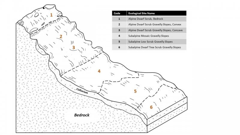 This subalpine site has soils prone to creep. This site occurs on mountain slopes at the highest subalpine bands of elevation before the true alpine life zone. This site occurs at a band of elevation with a harsh climate where trees are often stunted and grow in patches. The soils are dry for much of the growing season and are considered well to moderately well drained. The soils are gravelly and are typically formed in colluvium that is shallow to very deep. Since these soils are associated with creep, soils commonly have buried, mixed, and/or broken horizons. This site has a unique mosaic of tall scrub and meadow vegetation.