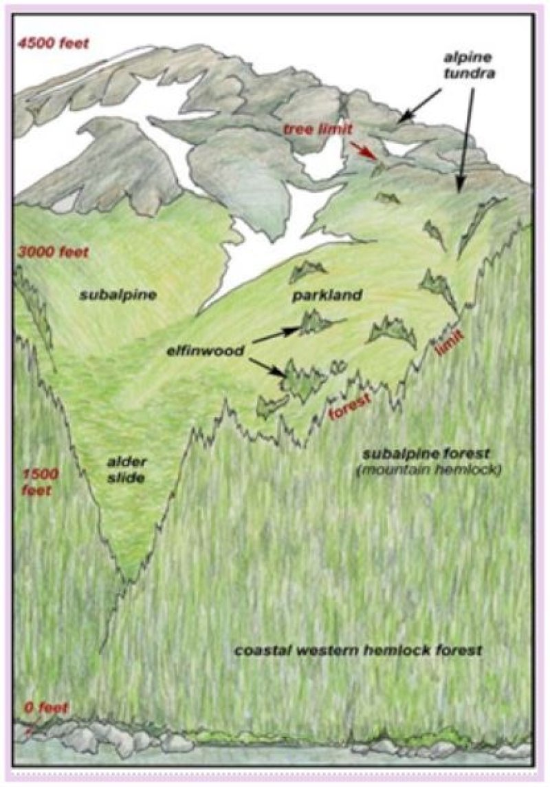 This area represents the Northern extent of the Pacific temperate rainforest and is characterized by productive stands of conifers. Western hemlock and Sitka spruce are the dominant trees on mountains and hills at lower elevations. Due to warmer temperatures, western red cedar and Alaska cedar are more prevalent in the southern portion of this area. Black cottonwood and mixed forest types occur on flood plains. Areas of peat and other sites that are too wet for forest growth support sedge-grass meadows and low scrub. As elevation increases, mountain hemlock becomes the dominant tree in forested stands, which marks the transition to subalpine vegetation. The subalpine life zone typically occurs at elevations between 1500 to 3000 feet (Boggs et al. 2010, Carstensen 2007, Martin et al. 1995). Other common subalpine plant communities include tall alder scrub and bluejoint-forb meadows. Alpine vegetation occurs at even higher elevations, which marks the transition to the Southern Alaska Coastal Mountains Area (MLRA 222).