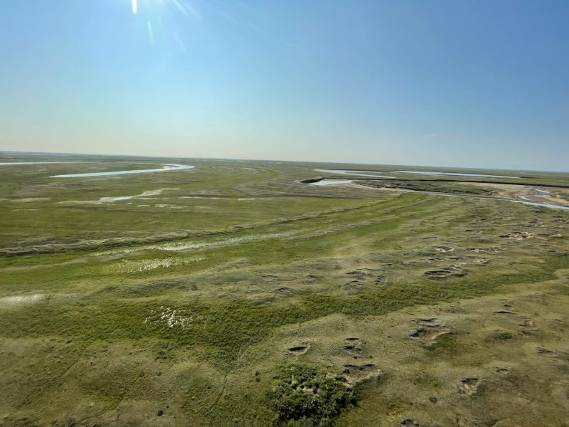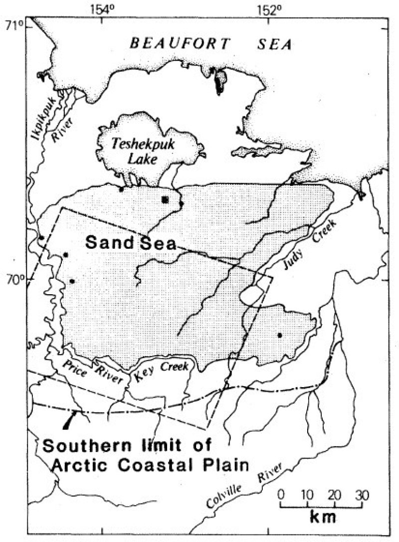 The Arctic Coastal Plain MLRA (MLRA 246X) consists of level to gently rolling plains along the coast of the Arctic Ocean. This area makes up 22,235 square miles. It is mostly remote, sparsely populated wildland. Numerous rivers, mostly originating in the Brooks Range, drain to the Arctic Ocean. The largest being the Canning, Colville, Jago, Kongakut, Kuk, Utukok, and Sagavanirktok Rivers. Narrow, nearly level flood plains and stream terraces parallel the many rivers. The area is dotted by thousands of small and medium-size lakes and interconnecting wetlands. Many of the lakes are elongated thaw lakes, which are consistently oriented from north to northwest. Small sand dunes occur along the coastline, rivers, and plains. Elevation ranges from sea level to about 655 feet.